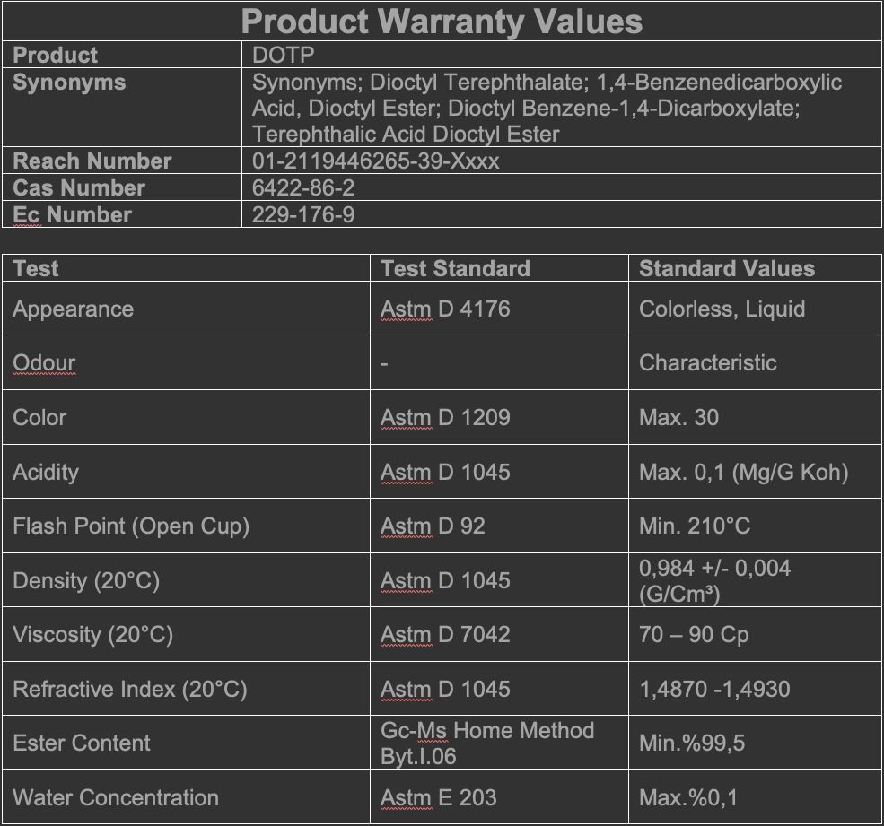Ester, free phthalate plasticizer, plasticizer obtained by the reaction of Terephthalic Acid and 2-Ethylhexanol.